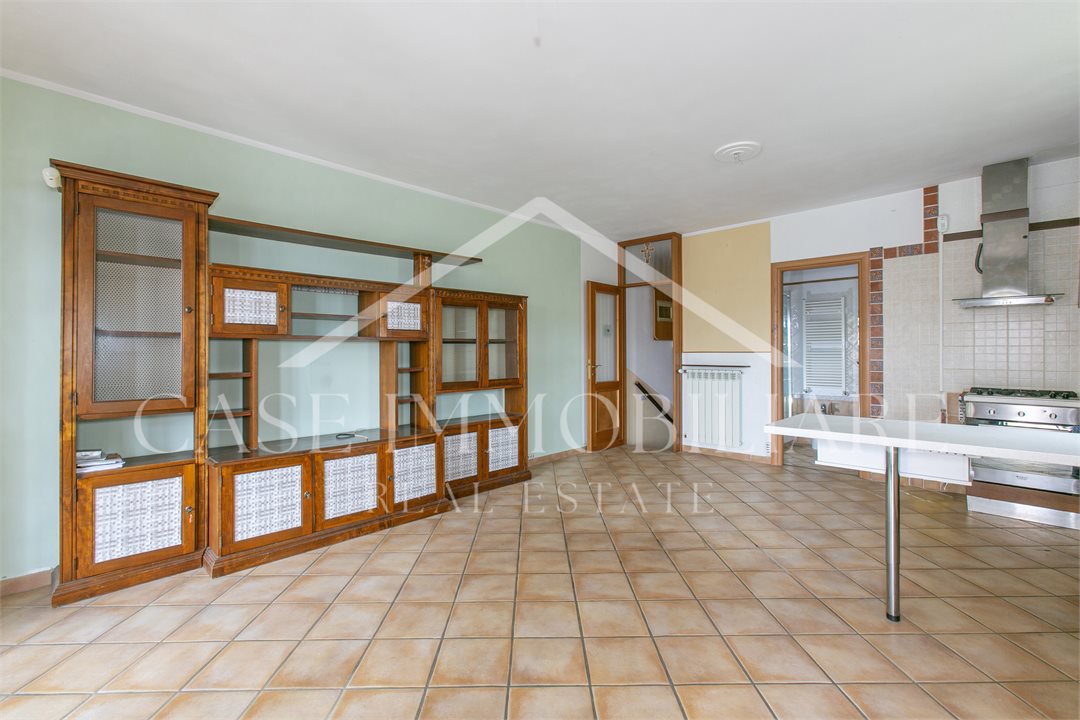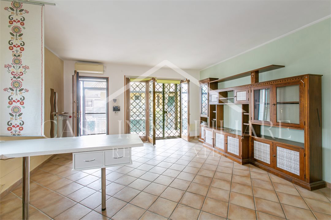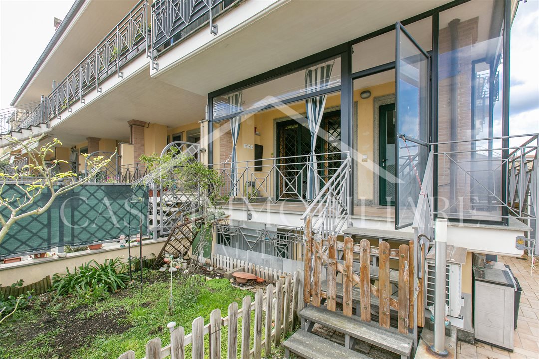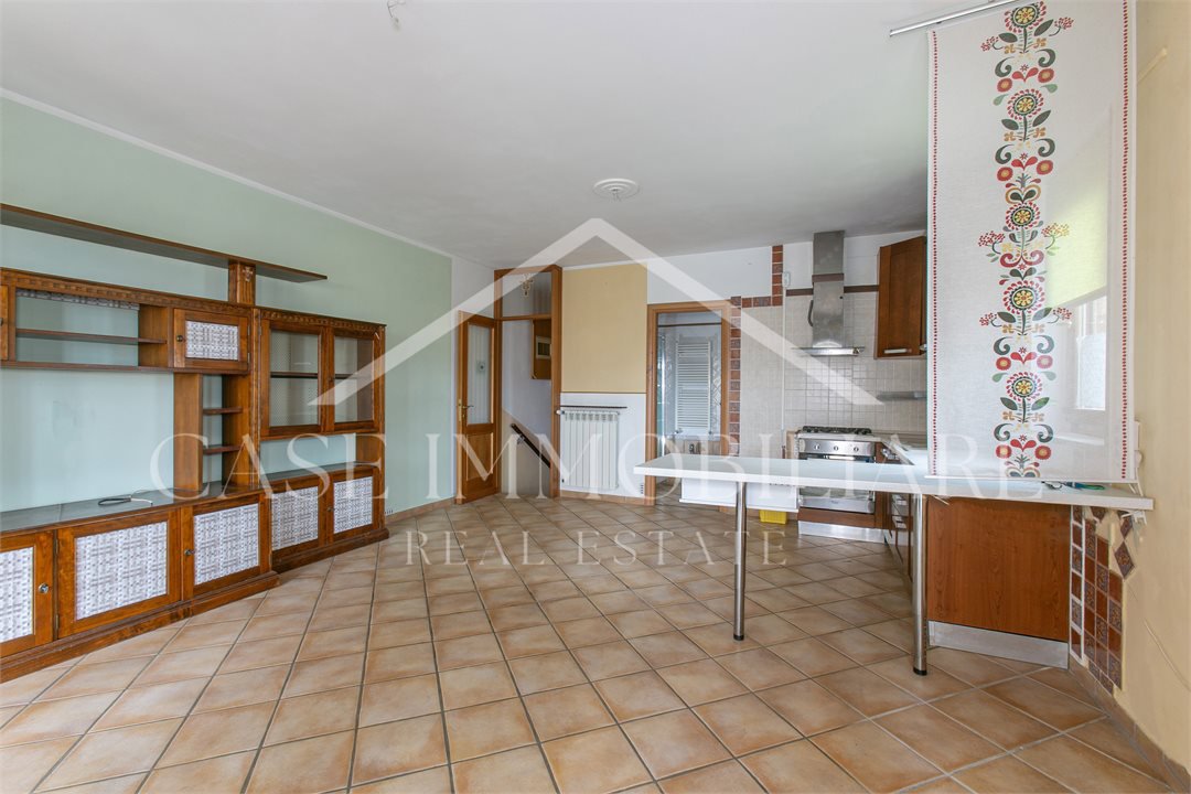 Il trilocale ha un salone con cucina a vista, due bagni e due camere oltre ad un gradevole spazio esterno, composto da un comodo portico ed un giardinetto parte pavimentato e parte a verde.
